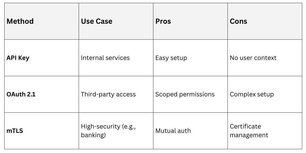 1. API Keys: Simple for server-to-server; store in headers like X-API-Key.