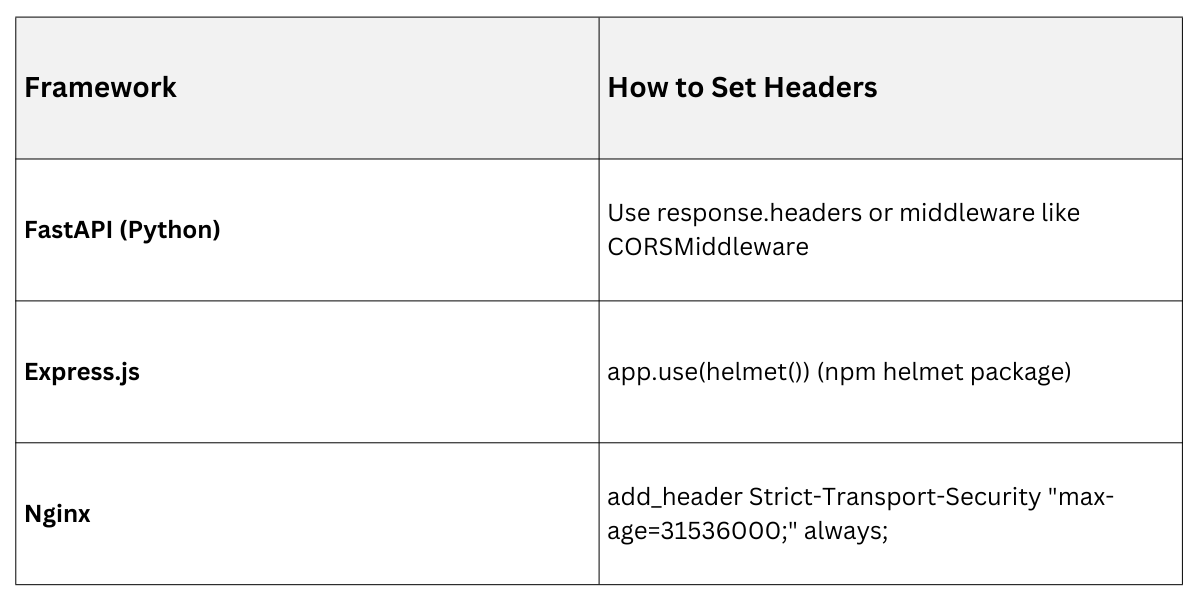 return {"message": "Secure response"}Essential Secure HTTP Headers