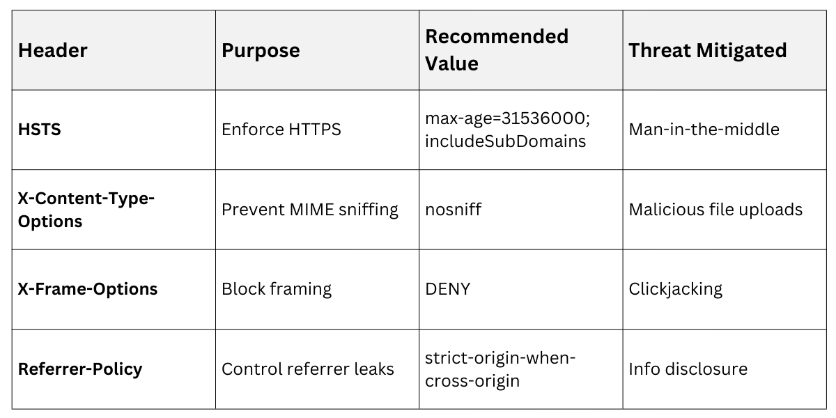 Each header targets a specific threat vector. Implement them progressively to avoid breaking legacy clients.