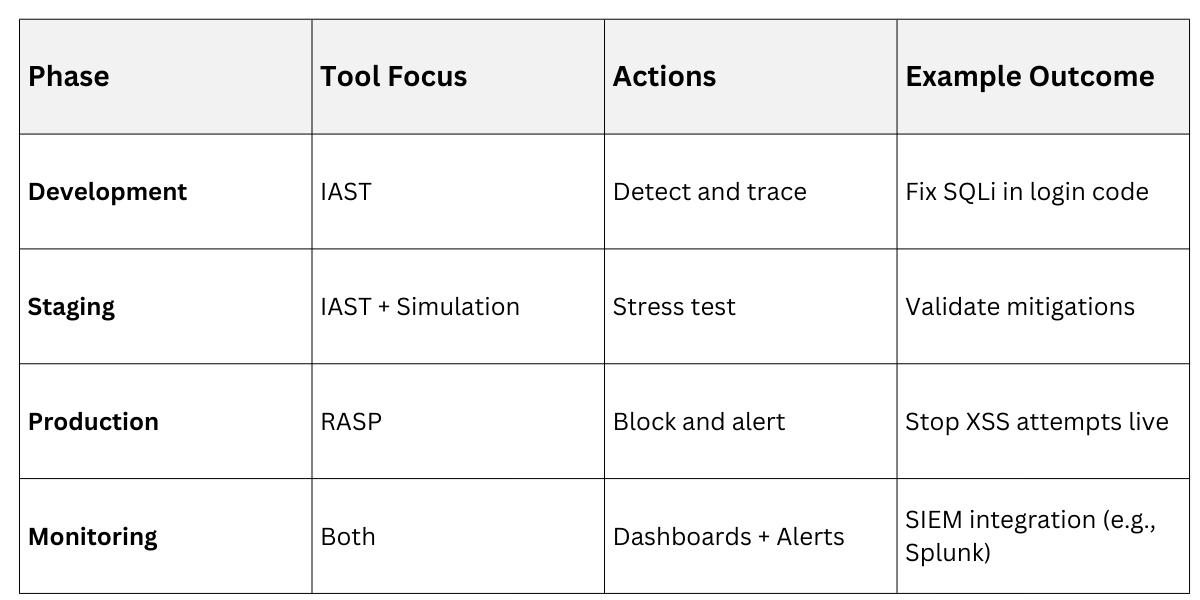 Combine them for end-to-end coverage: Use IAST in dev/test, flip to RASP in prod.
