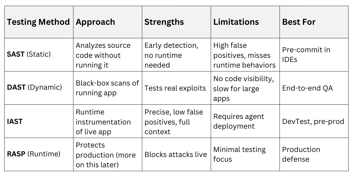 To grasp IAST's value, compare it with peers. It shines in interactive scenarios, like developer testing or staging environments.