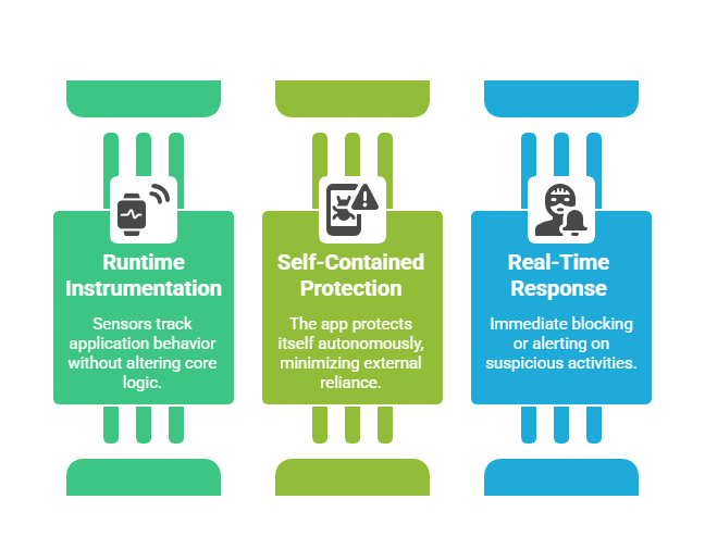 RASP operates as an embedded security layer within software applications, monitoring runtime behavior to detect and block attacks dynamically.