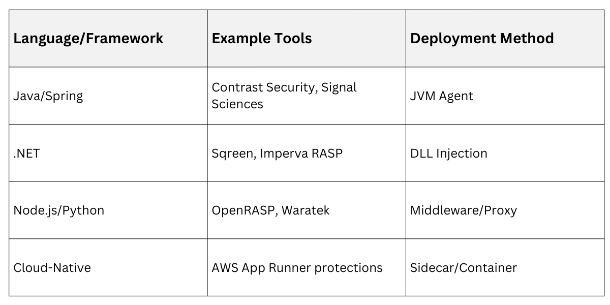 RASP solutions vary by language and architecture, with commercial and open-source options available. Choose based on app stack—e.g., Java agents for enterprise or lightweight libraries for Python/ Node.js.