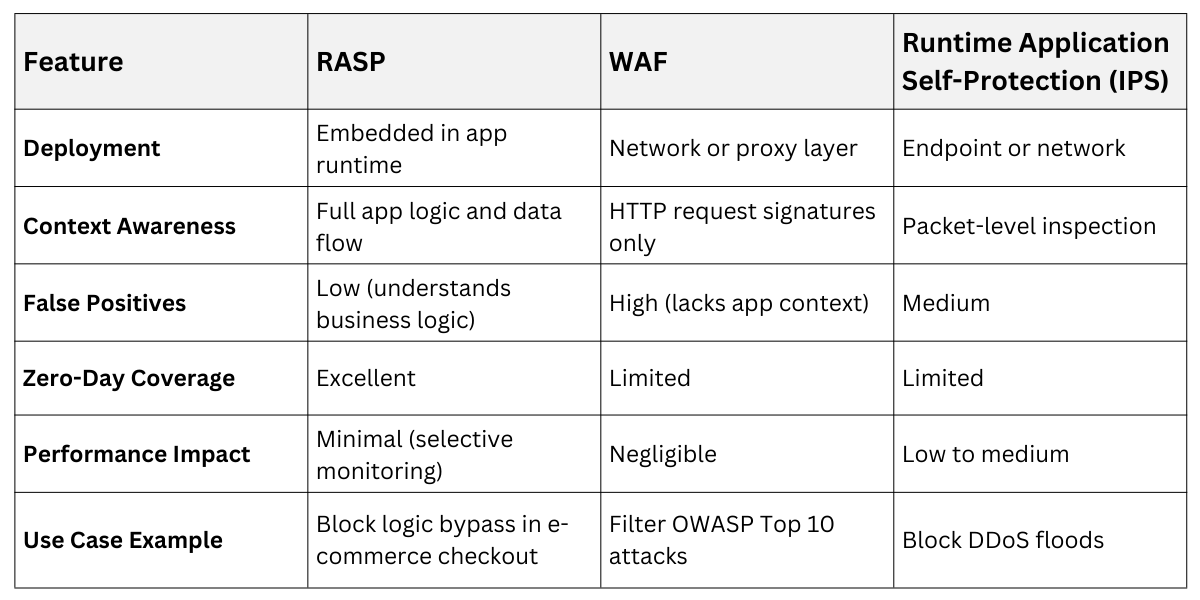 RASP complements rather than replaces perimeter defenses, offering superior accuracy due to its application-level insight. Perimeter tools like Web Application Firewalls (WAF) inspect traffic blindly, leading to higher false positives.
