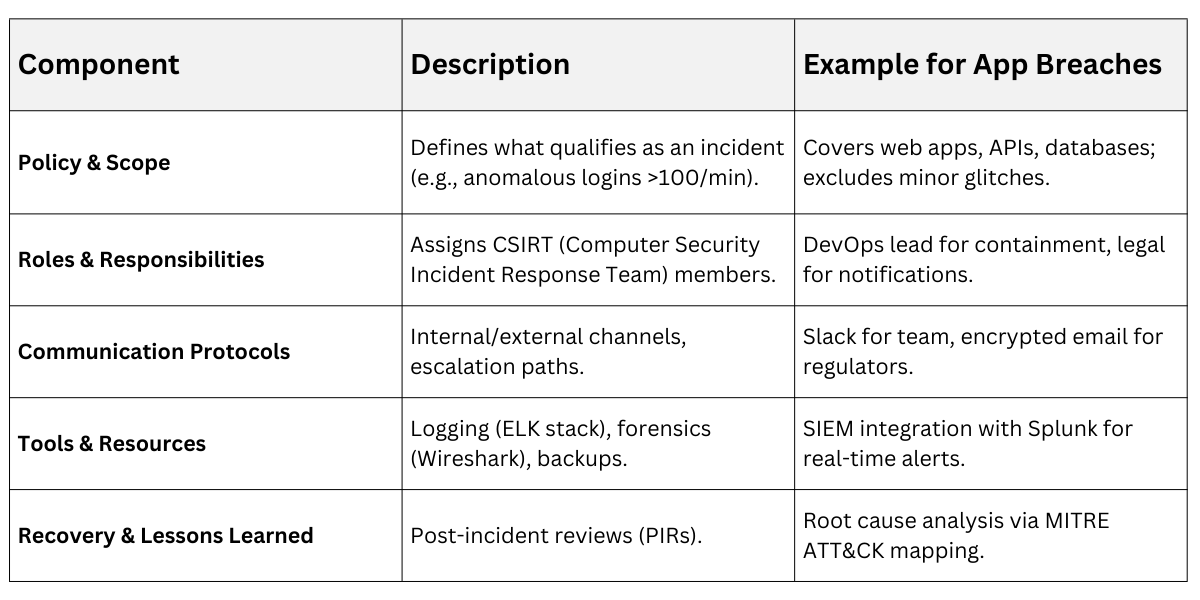An effective plan is a living document outlining roles, tools, and triggers—customized to your app's stack, like web apps with microservices or mobile backends. It evolves with threats, tested quarterly via simulations.