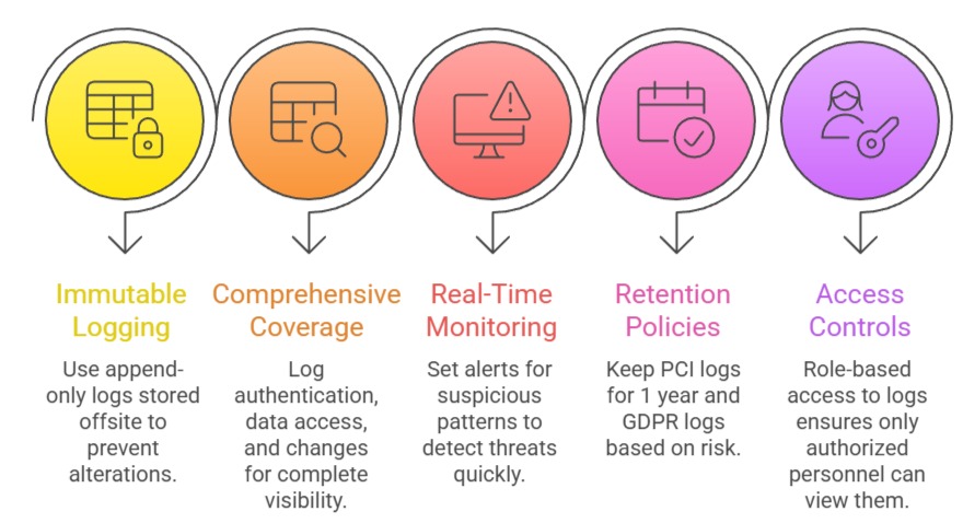 Example: A fintech app audits API calls, flagging a spike in PCI data exports as a potential insider threat.