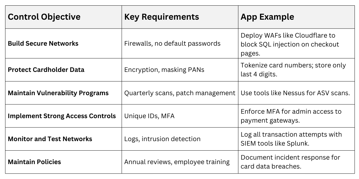 PCI-DSS comprises 12 core requirements grouped into six categories, focusing on secure networks, access, and monitoring. Compliance validates your app's payment flows, as seen in Stripe's PCI attestation boosting merchant trust.