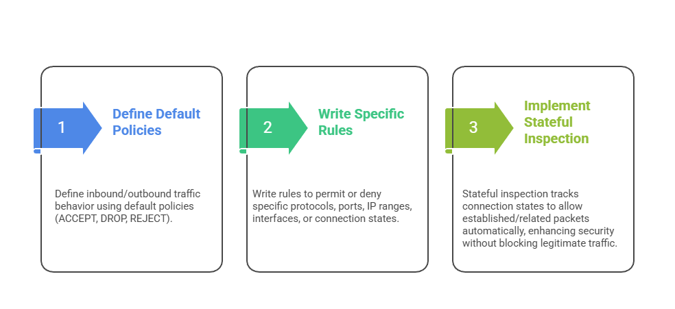 sudo nft list rulesetFirewall policies define what traffic is allowed or denied by default. The points below describe how filtering rules and connection tracking work together to enforce security.