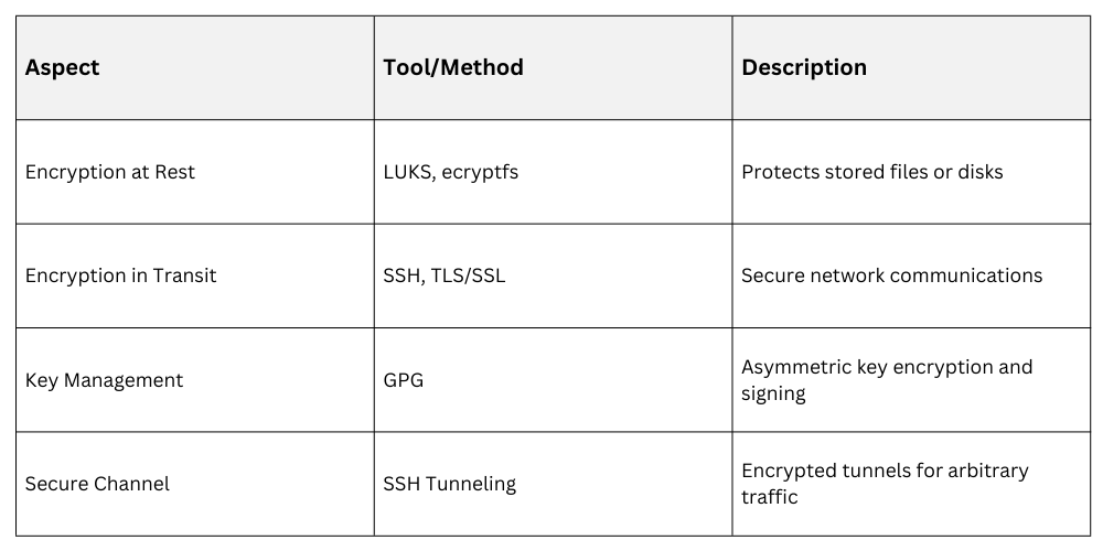 Tools like GPG enable cryptographic key management and data signing, SSH tunneling provides secure encrypted channels, while TLS/SSL certificates protect web and application traffic. Additionally, encrypted file storage and data protection during transfer are critical components of a secure Linux environment.