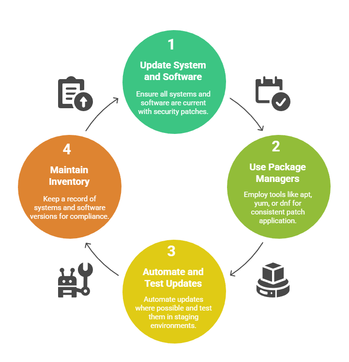 Patch management ensures systems and applications remain protected against known vulnerabilities. Following are the key practices used to maintain secure and up-to-date environments.
