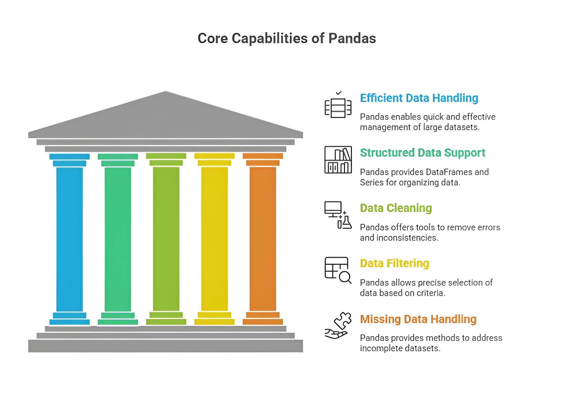 Pandas is widely used in Python data analysis workflows due to its powerful data manipulation and analysis capabilities. It allows analysts, data scientists, and researchers to efficiently process datasets, gain insights, and prepare data for visualization and modeling. The following points explain the main uses of Pandas in detail.