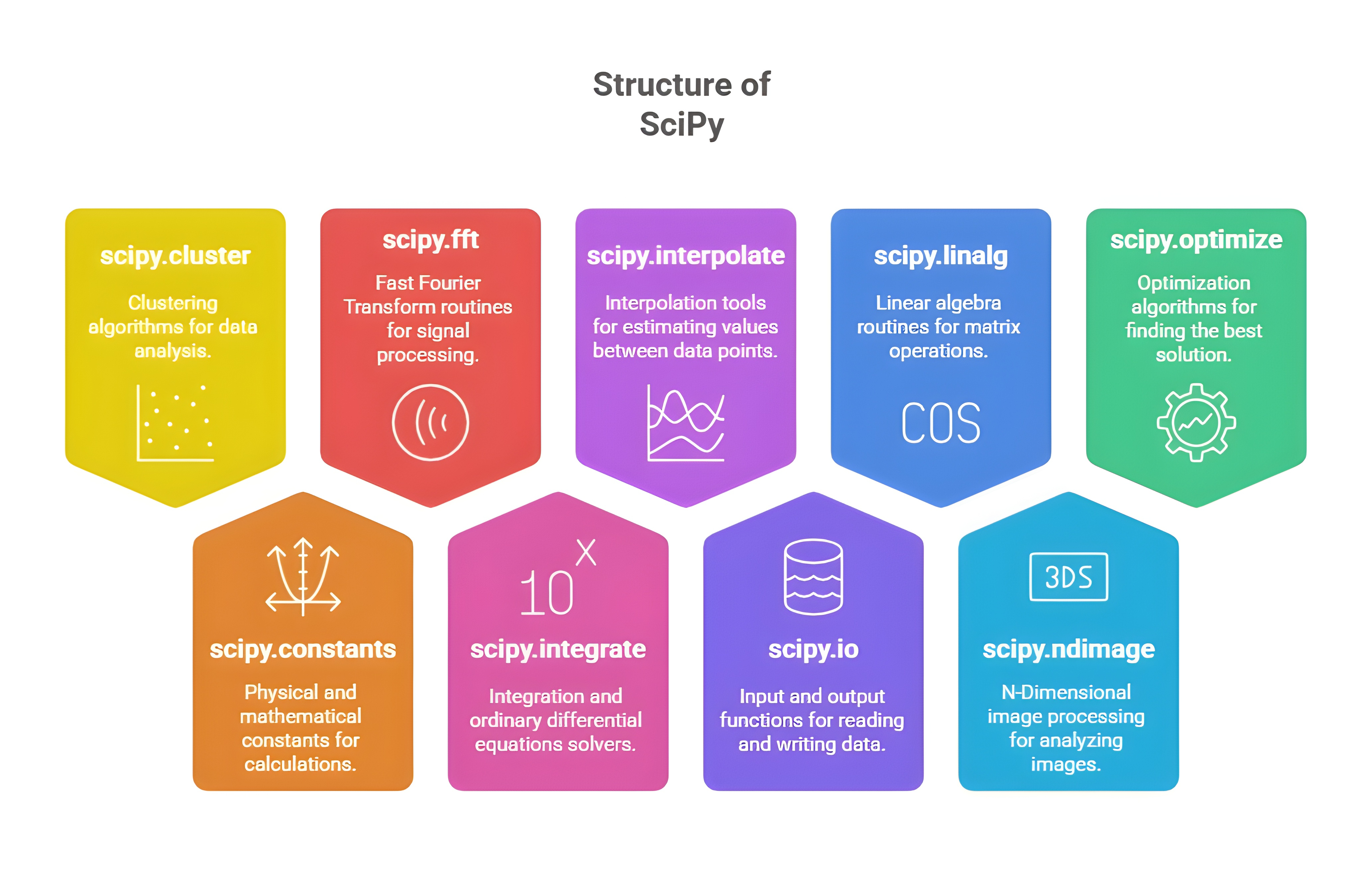optimize, integrate, linalg, stats, and signal offer targeted tools while maintaining compatibility with NumPy arrays. This structure allows users to use only the components they need without loading the entire library. Overall, SciPy’s modular design ensures flexibility, efficiency, and ease of use for complex computational tasks.pip or conda. For example, running pip install scipy installs the library, while conda install scipy works in Anaconda environments. Once installed, you can import SciPy or its subpackages using import scipy or from scipy import subpackage to access its functions. Overall, installation and import are straightforward, enabling quick use of SciPy’s powerful scientific computing tools.