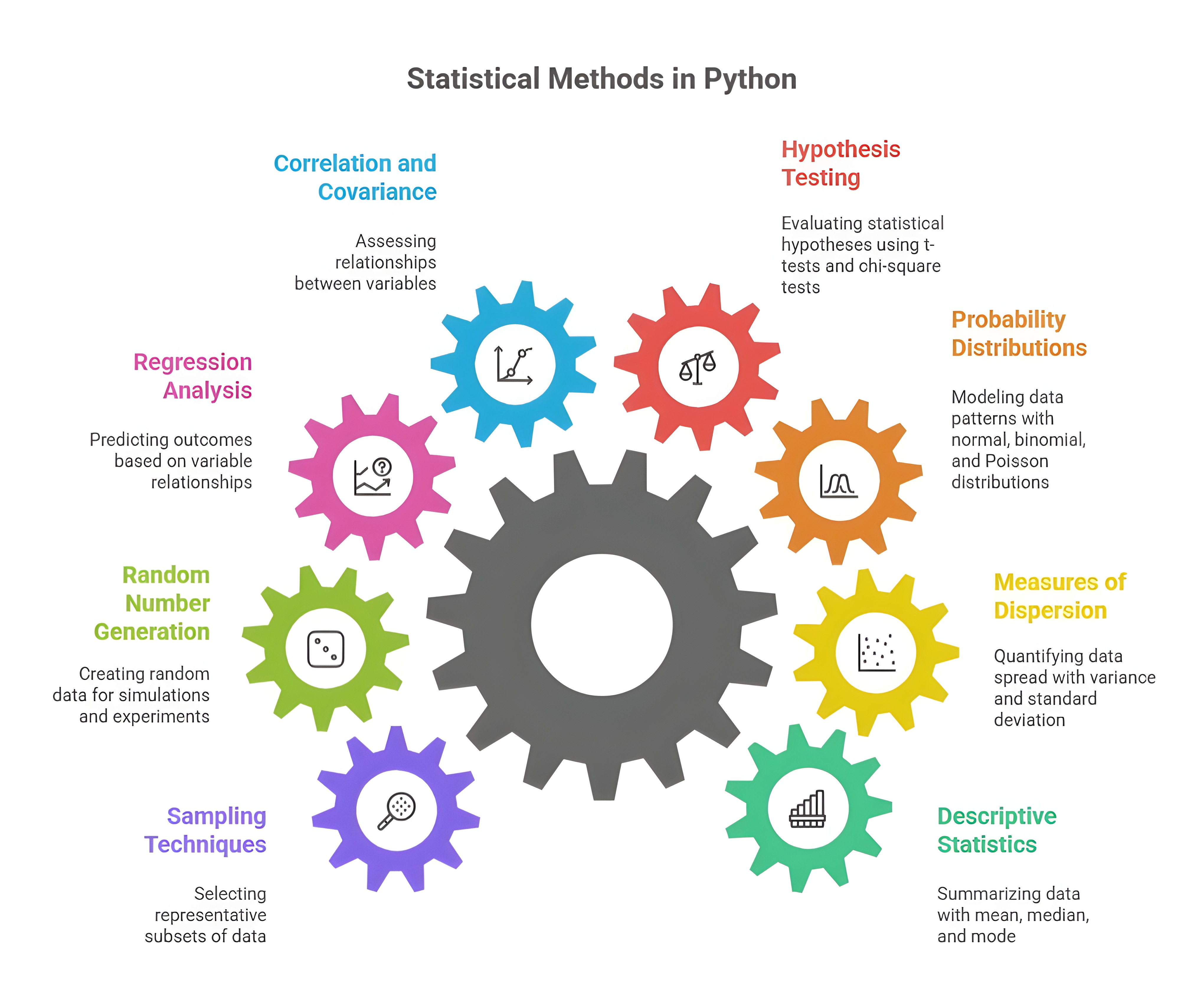 Using Python, data scientists can perform comprehensive statistical analysis and probability modeling efficiently due to its rich ecosystem of libraries. Libraries like NumPy and SciPy provide functions for descriptive statistics, probability distributions, hypothesis testing, and advanced statistical computations. Pandas allows easy calculation of measures such as mean, median, variance, standard deviation, correlation, and covariance directly on datasets. Additionally, Python’s Statsmodels library enables formal statistical modeling, including linear regression, time series analysis, ANOVA, and generalized linear models, while Scikit-learn incorporates probabilistic methods in machine learning algorithms such as Naive Bayes, Bayesian inference, and ensemble techniques.