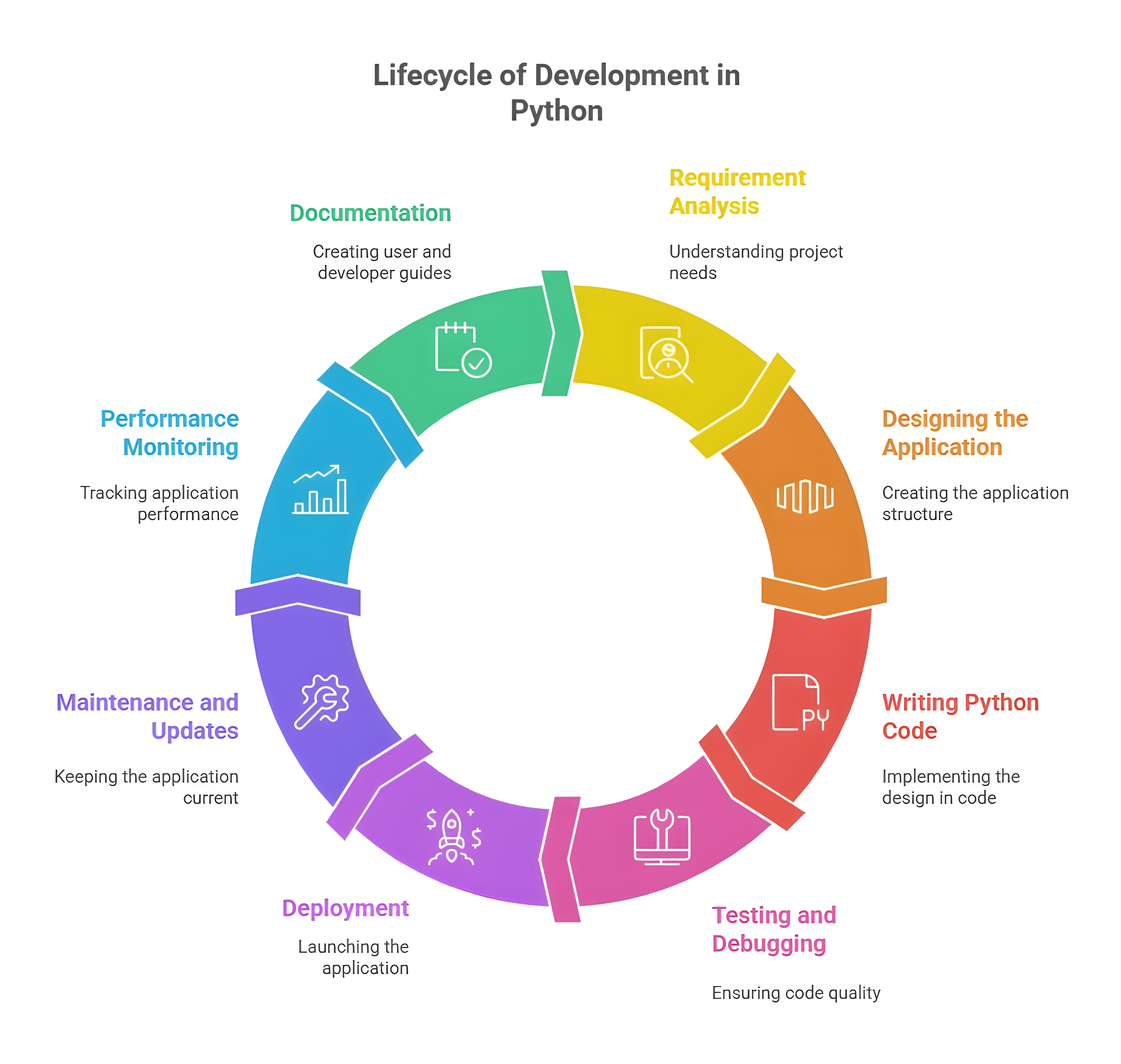 After deployment, the Python application enters the maintenance phase. This includes monitoring performance, fixing bugs, optimizing code, and adding new features based on user feedback. Python’s simplicity and readability make maintenance easier, allowing developers to quickly understand and modify the existing code. Continuous maintenance ensures the application remains functional, secure, and up-to-date with evolving business needs or technological advancements.