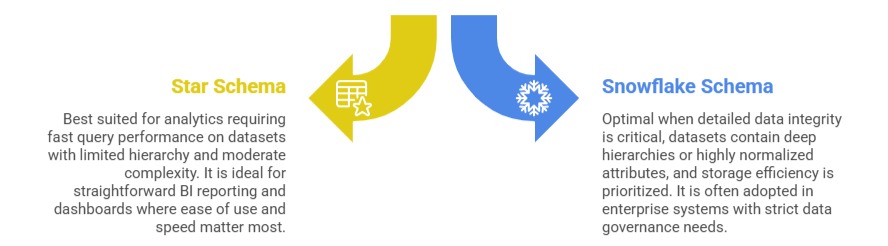 While this results in more complex queries involving additional joins, it offers better data integrity, reduced storage space, and is well-suited for handling detailed hierarchies and complex dimensions.