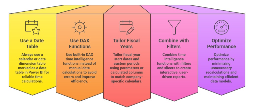 Time intelligence calculations help analyze performance across different time periods. The key calculations listed below explain how DAX enables meaningful period-based comparisons and trends.