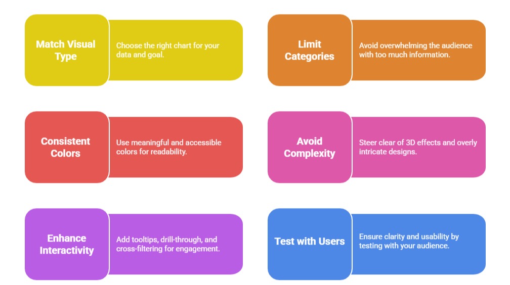 Whether using charts, KPIs, maps, or tables, the goal is to present data clearly, accurately, and intuitively while minimizing unnecessary clutter or confusion.