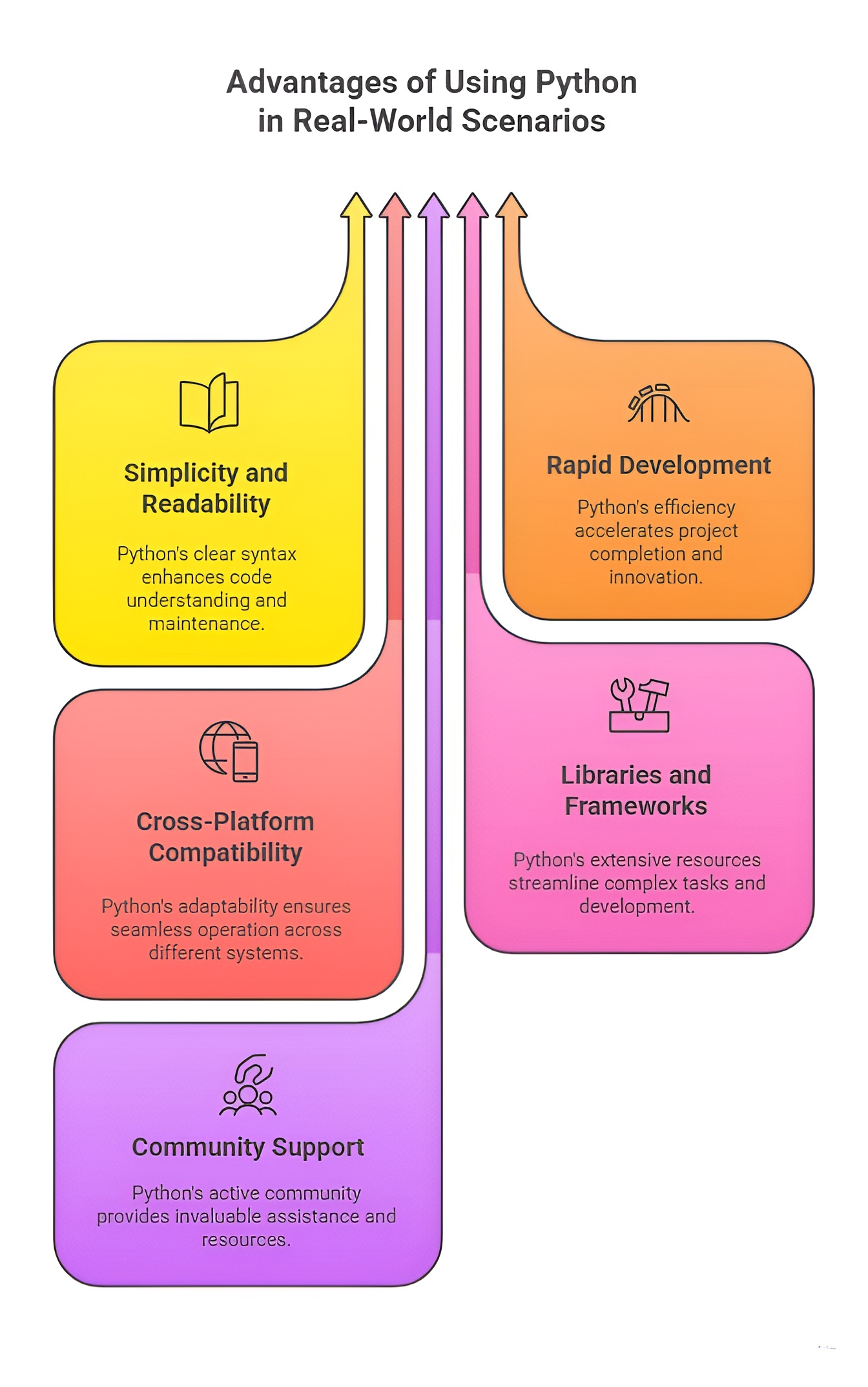 Python has one of the largest global programming communities. This extensive support network provides tutorials, forums, open-source tools, and troubleshooting resources. Real-world projects benefit from this because developers can quickly find solutions, adopt best practices, and keep up with modern trends in technology.