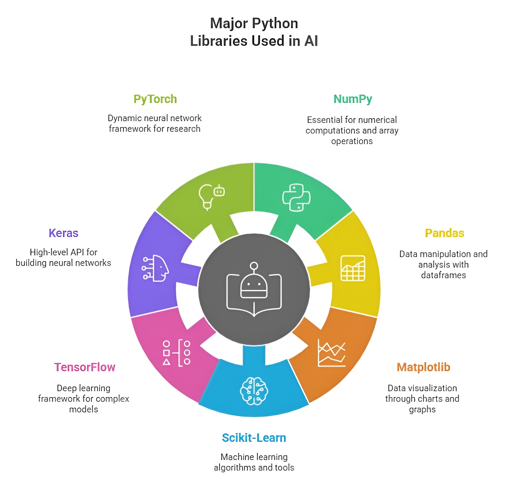 Python libraries form the backbone of AI development, providing pre-built functions, tools, and frameworks that simplify the implementation of complex algorithms. These libraries reduce development time, minimize coding errors, and allow AI developers to focus on problem-solving rather than low-level programming. The importance of Python libraries lies in their ability to accelerate research, enhance productivity, and enable the deployment of robust, scalable AI applications across industries such as healthcare, finance, robotics, and natural language processing.