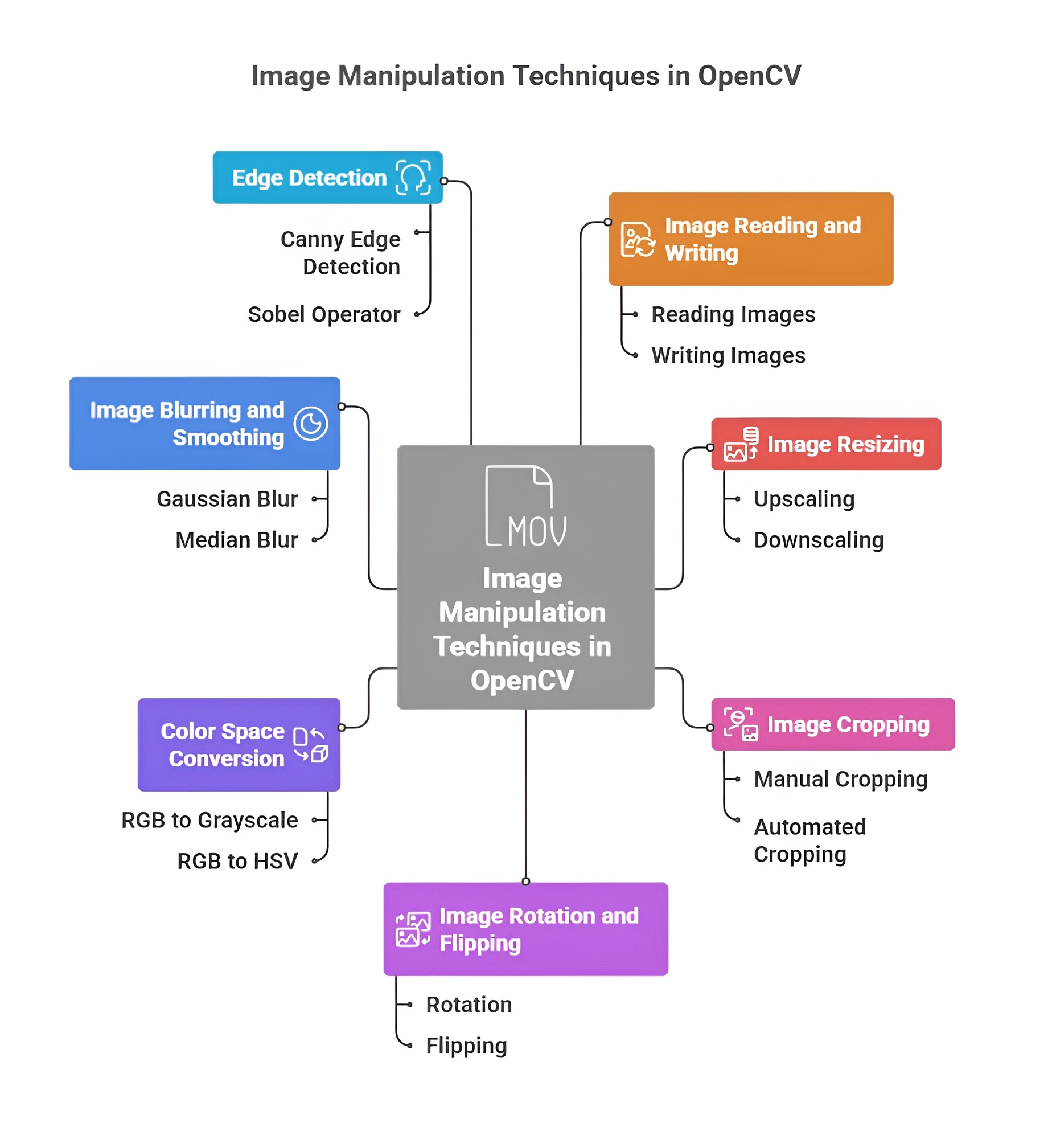 Image manipulation in OpenCV represents the foundational layer of transforming raw pixel data into a structured form that computers can easily analyze, interpret, or use for advanced computer vision tasks. These techniques modify the geometry, scale, orientation, or visual content of an image, allowing systems to standardize input data, highlight essential regions, remove distortions, and create augmented variations needed for training robust AI models. By offering direct control over pixel matrices, OpenCV makes image manipulation an essential part of preprocessing, visualization, and algorithm development in real-world vision applications.
