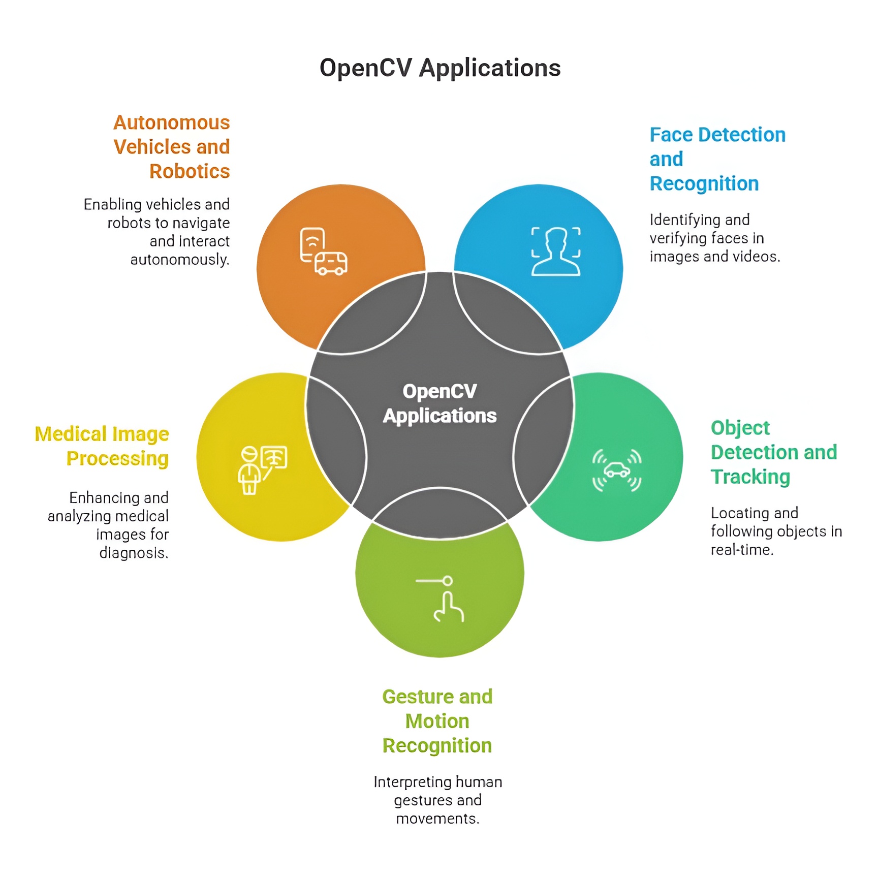 OpenCV is widely used in face detection and recognition systems found in smartphones, security devices, and attendance systems where fast identification is essential. It plays a major role in surveillance and traffic monitoring by enabling object tracking, vehicle counting, and activity detection for safety and law enforcement. In automation and robotics, OpenCV supports tasks like path tracking, obstacle detection, and visual inspection, helping machines navigate and interact with their surroundings intelligently. In the healthcare sector, it assists with analyzing medical images and detecting abnormalities, improving diagnostic speed and accuracy. It is also used in retail for barcode scanning, product recognition, and visual search features that enhance customer experience and operational efficiency.