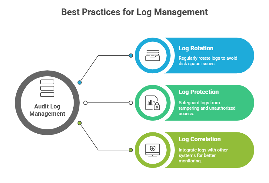 Effective audit log analysis helps detect unauthorized activity and supports investigations. The key practices and commands used for analyzing audit logs are described below.