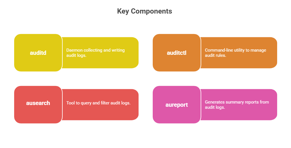 Configuring auditd involves installing the service and defining rules to monitor security-relevant system events. The key configuration steps and rule types are outlined below.