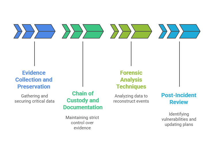 Forensic readiness involves preparing systems and processes to capture actionable evidence during incidents. The following points explain the essential steps for evidence management and post-incident analysis.