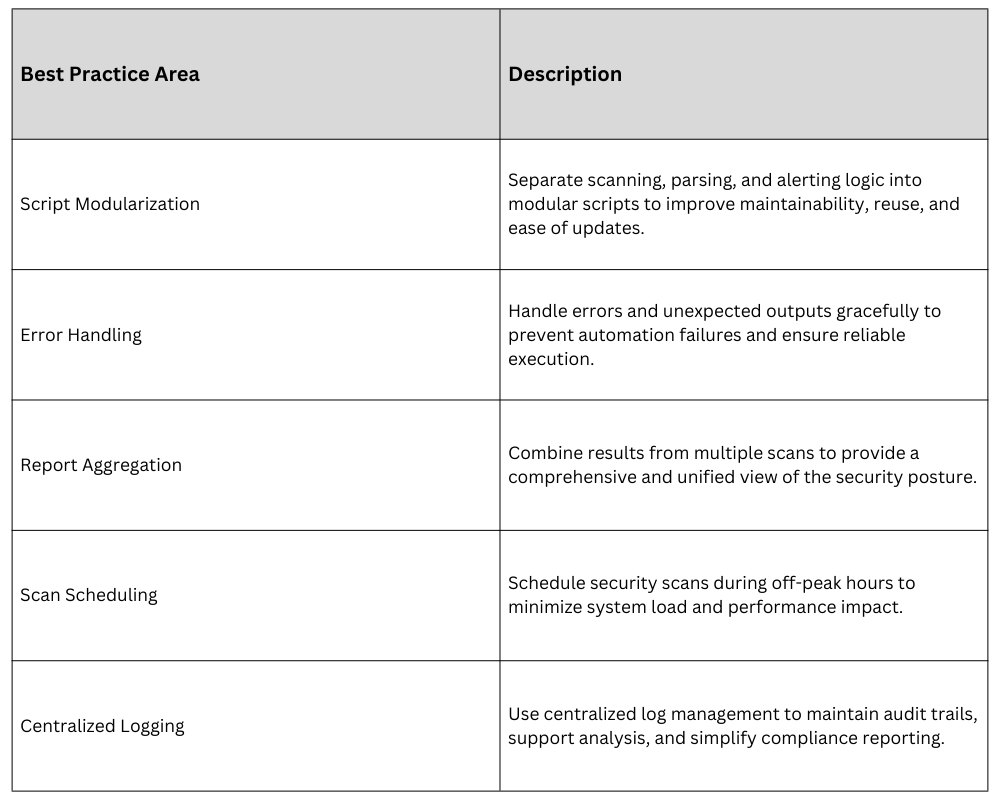 fiBest Practices: Running scans regularly through cron jobs or systemd timers to ensure continuous security assessment. Detailed logging should be enabled to support auditing, compliance, and troubleshooting activities. Additionally, customizing Lynis profiles for environment-specific checks helps ensure the scans are aligned with organizational policies and system requirements.