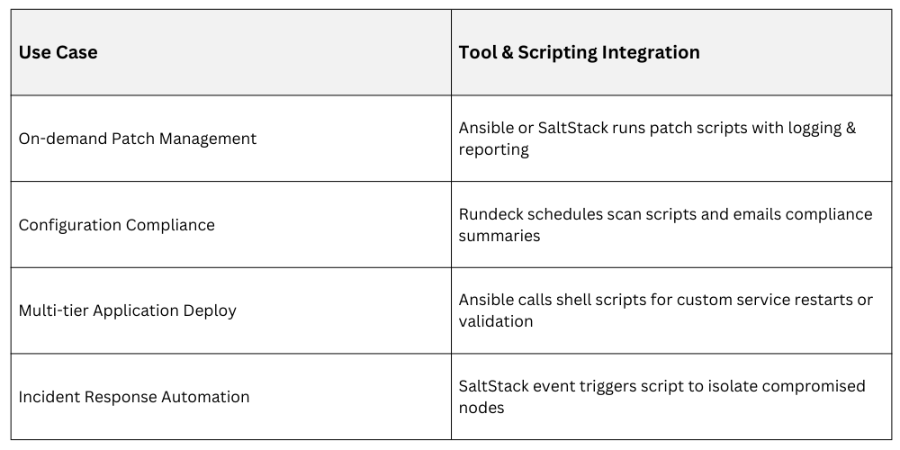 These orchestration tools simplify large-scale system management by enabling repeatable, automated workflows. They integrate seamlessly with shell scripts to support real-world operational use cases.