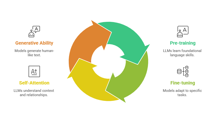 3. Self-Attention and Contextual Modeling: LLMs use transformer-based self-attention mechanisms to assess the relevance of all tokens in input text, making them adept at understanding context and relationships in long passages.