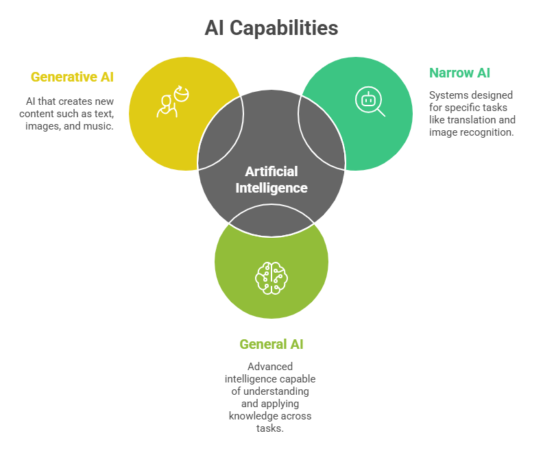 AI technology enables systems to simulate human cognitive functions, helping automate complex processes and improve efficiency across various domains. AI can be categorized into three primary types based on its capabilities: Narrow AI, General AI, and Generative AI.