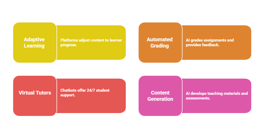 AI creates personalized learning experiences, automates administrative tasks, and supports innovative teaching methods.