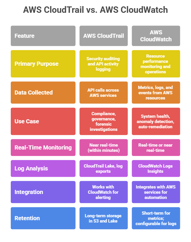 Together, CloudTrail and CloudWatch enable AWS users to maintain secure, compliant, and high-performing cloud environments by providing comprehensive visibility into their infrastructure and user activity.