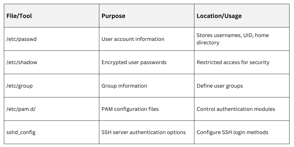 The list below outlines how user identities are confirmed before access is granted. It also introduces PAM as the backbone of Linux authentication.