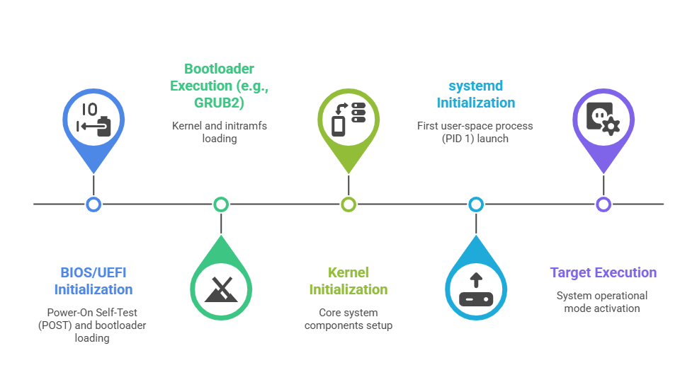 4. systemd Initialization: Once the kernel setup is complete, it starts systemd as the first user-space process with process ID 1 (PID 1). systemd reads its unit configuration files and begins launching and managing all services, devices, mount points, and system targets.