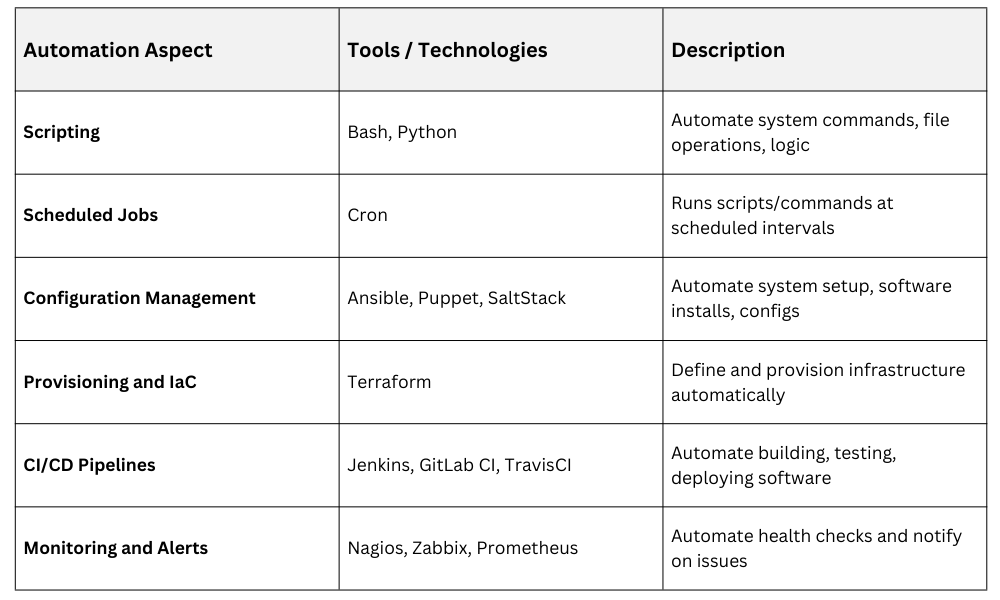 2. Configuration Management: Defining and enforcing system states consistently across multiple servers using tools like Ansible, Puppet, or SaltStack.