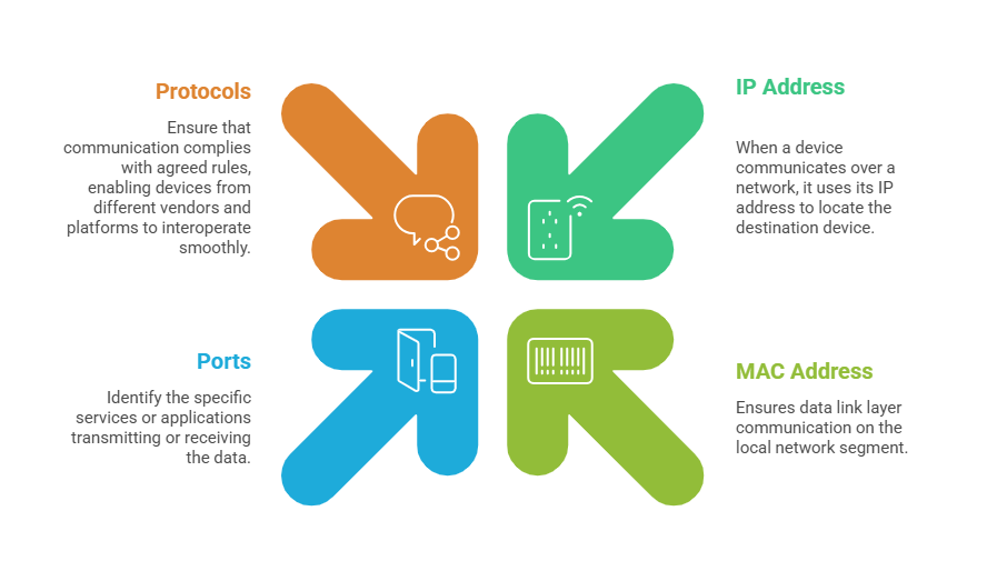 Ports are logical endpoints used by devices to manage multiple services and communication sessions simultaneously. Each port is identified by a number from 0 to 65535, with well-known ports such as 80 for HTTP and 443 for HTTPS.
