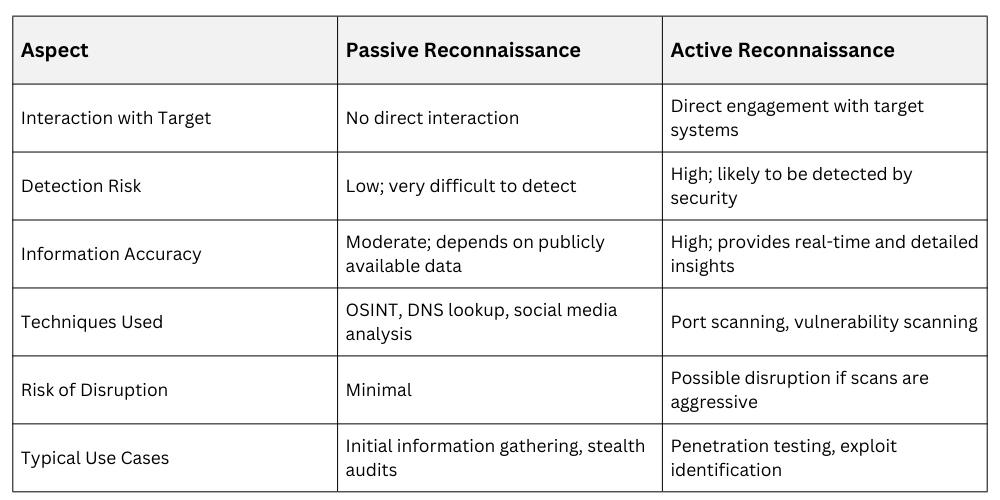 Reconnaissance can be broadly categorised into two types: passive and active. Each type has distinct methods, advantages, and risks, playing unique roles in security assessments and attacks.