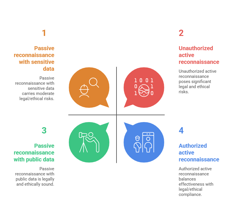 Active reconnaissance requires direct interaction with the target system or network to gather information. This method uses techniques like port scanning, ping sweeps, banner grabbing, vulnerability scanning, and traceroute analysis.