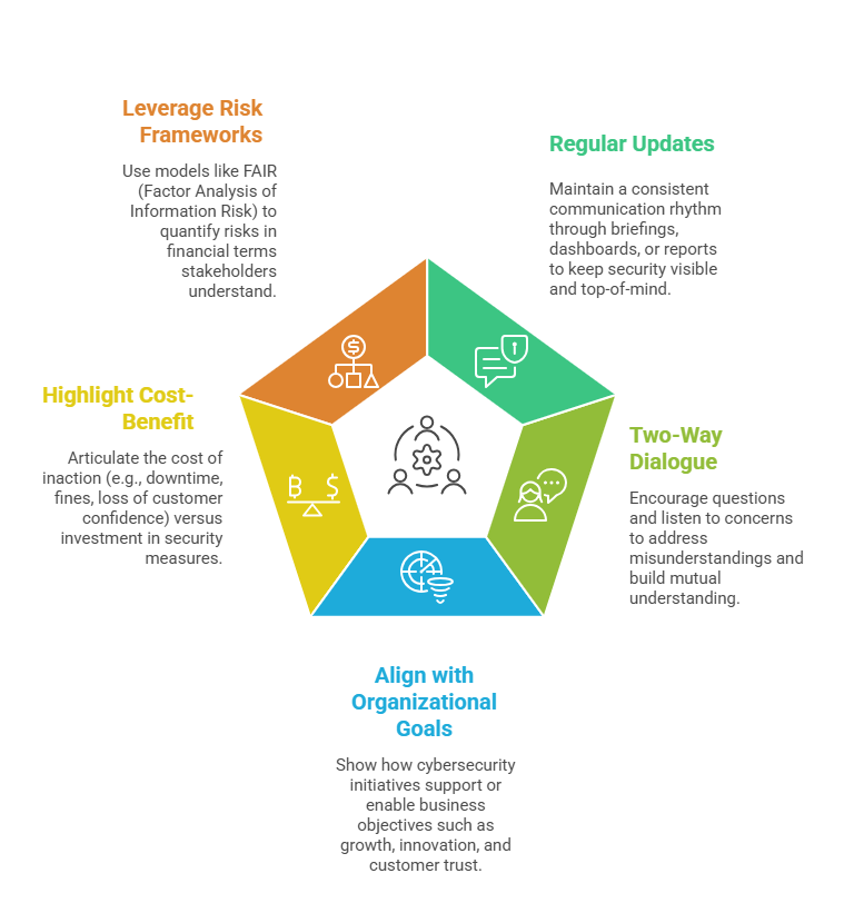 Bridging the technical-business gap is essential for securing support, resources, and trust. Highlighted here are effective methods to explain cybersecurity risks, their impacts, and mitigation strategies:
