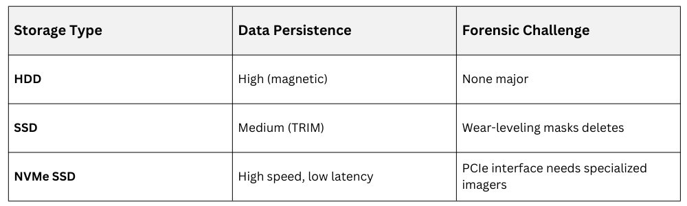 3. Hybrid Drives (SSHDs): SSD cache + HDD bulk storage; forensics requires full imaging to capture both.