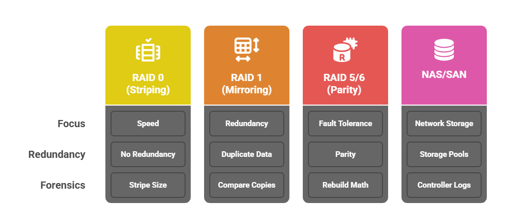 Note: RAID levels dictate reconstruction; wrong order corrupts data.