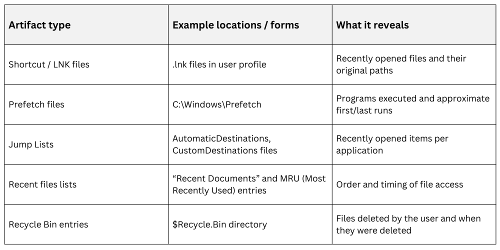 They are not limited to files themselves but also include logs, shortcuts, histories, and metadata that indirectly reflect user behavior. When correlated, these artifacts answer core investigative questions: who did what, when, where, and how on a given system.