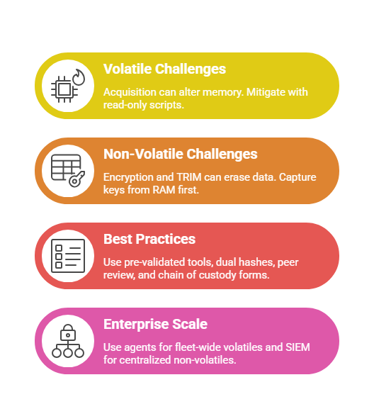 In ransomware scenarios: Volatile network connections trace C2; non-volatile $LogFile shows encryption sequence. Modern tools blend tiers seamlessly, but principles ensure defensibility.