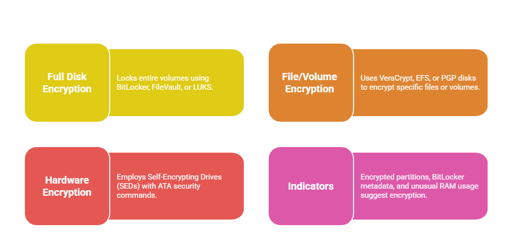 Encryption protects data at rest and in transit, but forensic workflows prioritize capturing encryption keys from volatile memory before shutdown, followed by systematic key recovery or bypass methods.