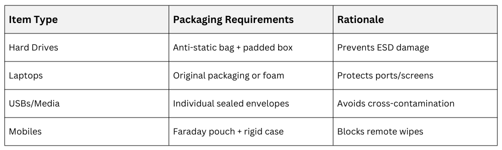 2. Place in anti-static bags; seal in tamper-evident containers (bubble wrap for drives).