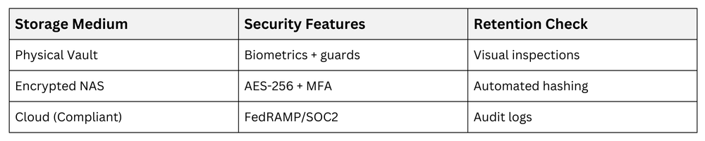 3. Digital storage: Encrypted NAS/S3 with immutability (WORM policies), redundant backups.