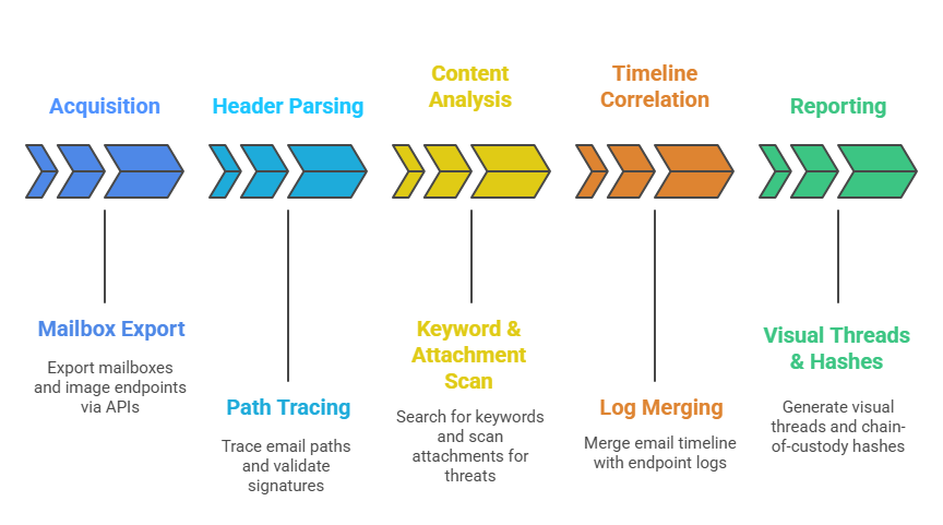 Analysis spans traditional email protocols and modern platforms like Microsoft Teams or Slack, ensuring chain of custody through header parsing and artifact correlation.