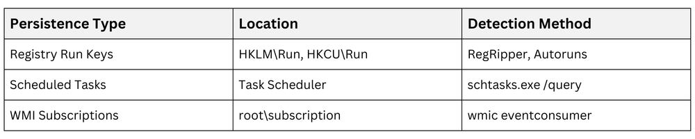 Registry Run/RunOnce keys (Windows: HKLM\Software\Microsoft\Windows\CurrentVersion\Run) execute payloads on startup. Scheduled tasks (schtasks /query) launch at triggers; WMI event subscriptions persist via repositories.